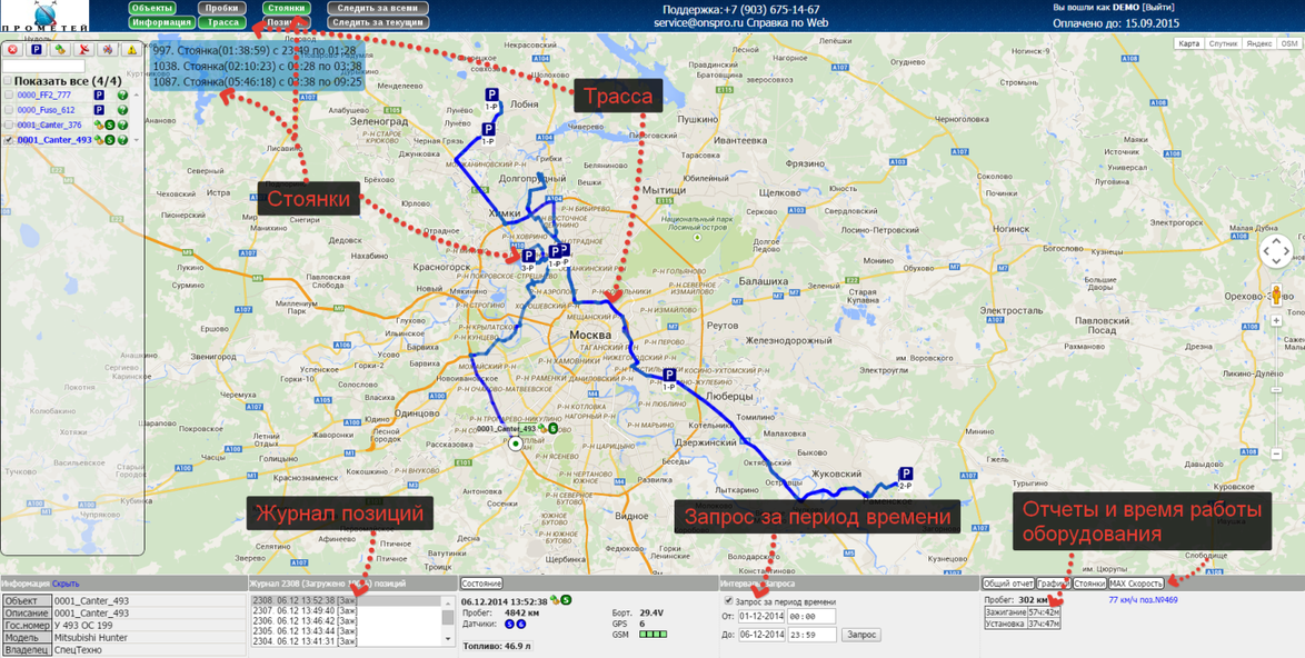3. Выбираете ТС из списка (если отметить только галочку, то ТС только отобразится на карте). После чего загружаются с сервера данные о ТС и позиции за выбранный период. Если "Запрос за период времени" не выбран, то данные загружаются с сервера в режиме онлайн.