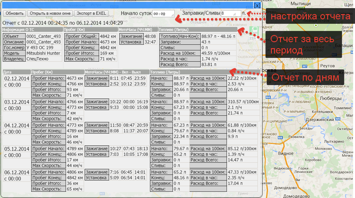 В открывшемся окне вы можете указать начало суток для отчета по дням (отчет по дням будет строиться с указанного времени текущего дня до этого же времени следующего) и минимальное значение определения заправок и сливов (по умолчаниею 8 литров), после чего нажать «Обновить».